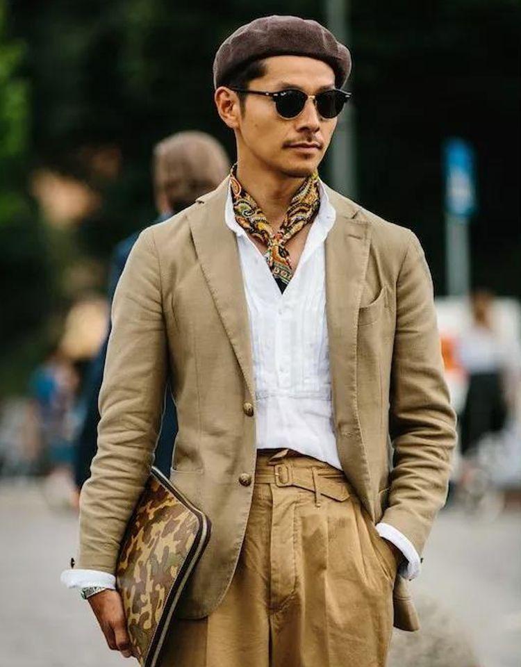 男人佩戴丝巾,是一种优雅的体现,选款上注意 “选小不选大”,印花颜色尽量与服装呼应 ,才能避免显得突兀。