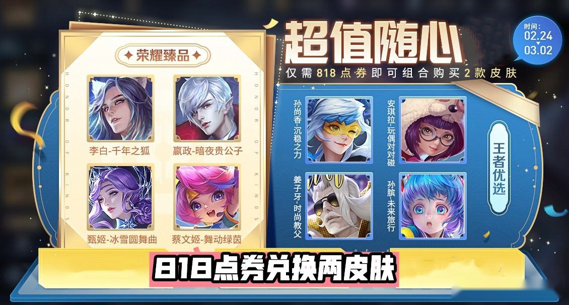荣耀臻品和王者优选两大奖池再次开放,合计16款皮肤供玩家选择,比如内含嬴政暗夜贵公子、李白千年之狐两款无法通过碎片商店兑换的史诗,玩家消耗818点券可以在两个奖池分别选择一款皮肤获取。