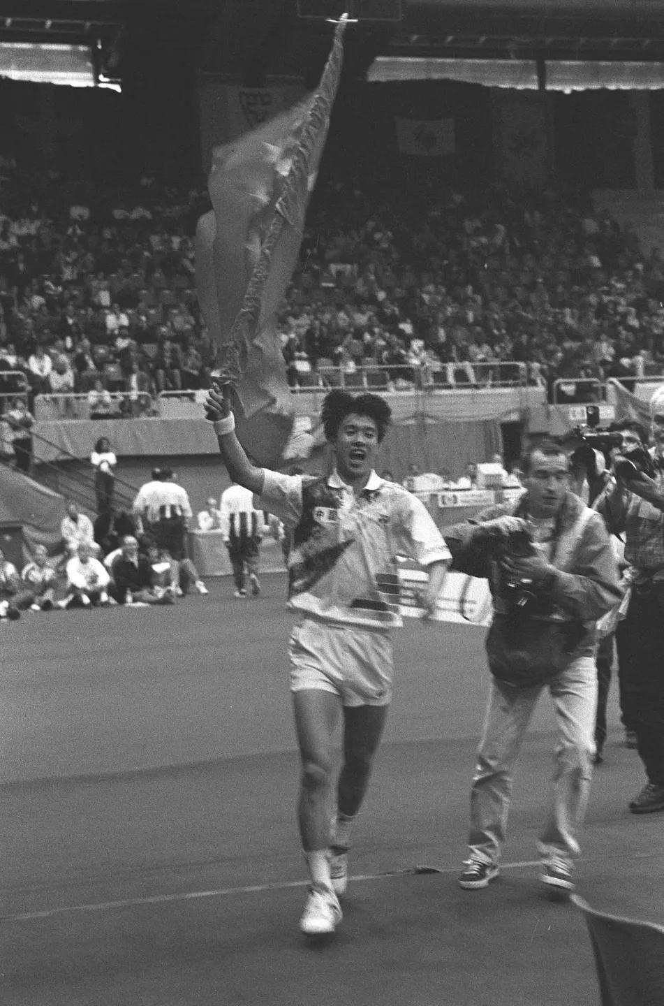 (图为1995年中国队首夺苏迪曼杯冠军,孙俊在绕场地庆祝)