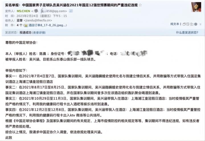 吴兴涵事件女主陈晨放出了一张自己向中国足协发送举报邮件的截图,她列举了吴兴涵4个违规违纪的事实,时间跨度从2021年7月至2021年12月。而当时吴兴涵正在跟随国家队,在上海集训备战世预赛12强赛。