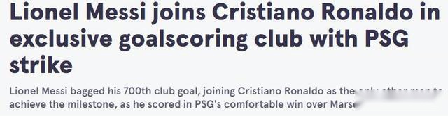 法国媒体《巴黎人报》称:梅西在巴黎圣日耳曼轻松战胜马赛的比赛中进球,收获了他的第700个俱乐部进球,成为继C罗之后唯一一个达到这一里程碑的人。