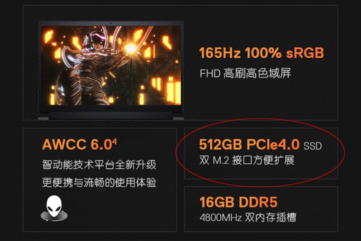 在产品介绍上不难看到,宣传双M.2插槽的比重稍微大了一点,看来戴尔2022年的骚操作把自己弄得很受伤。整个2022年所有的G15、G16笔记本都是单M.2插槽,而且并非没设计,而是主板上明明有第二个M.2的位置却不给焊上接口,没人知道为什么。由于国内同类产品太多竞争太激烈,原本其他方面都还不错的戴尔游戏本就这么彻底沦为了小透明。