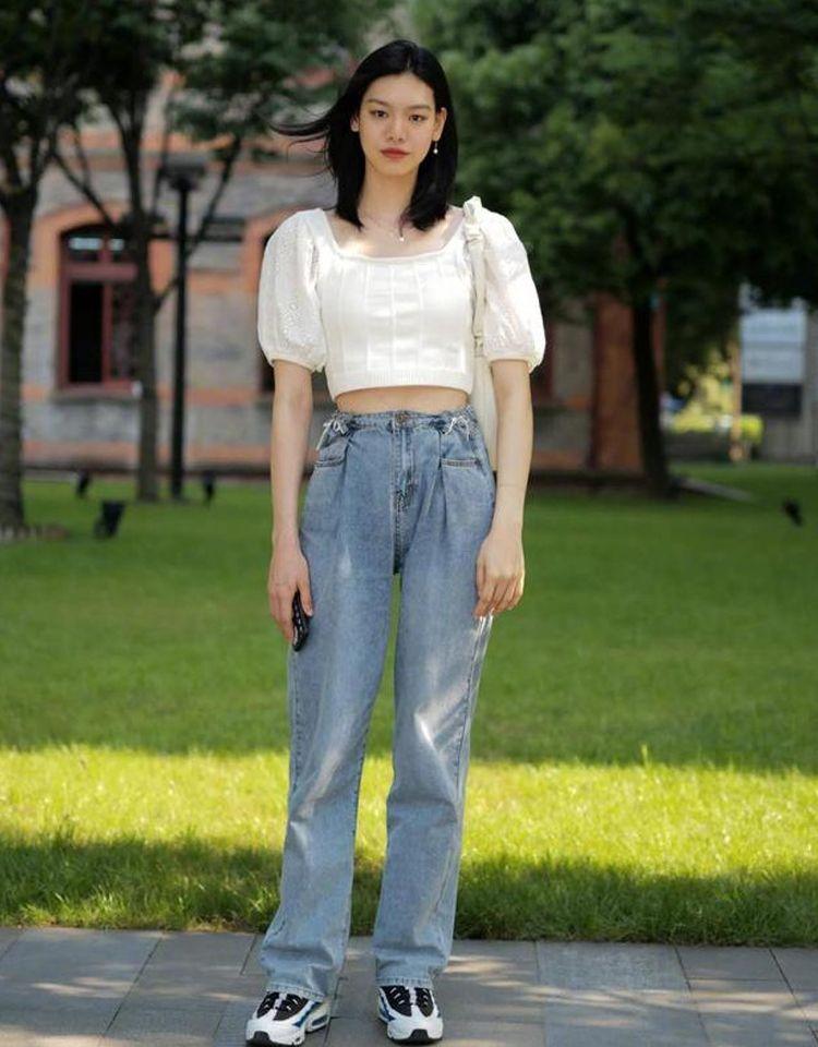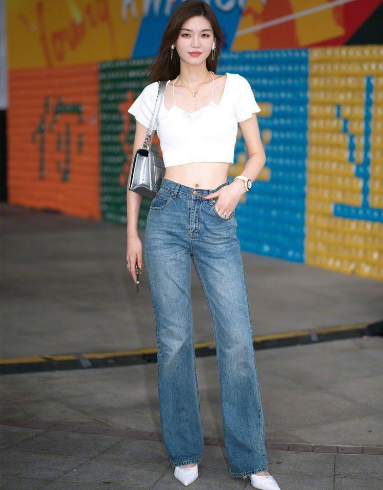 比如露腰T恤背心搭配牛仔裤, “上短下长” 塑造三七分比例,简单干练的造型又美又高级。