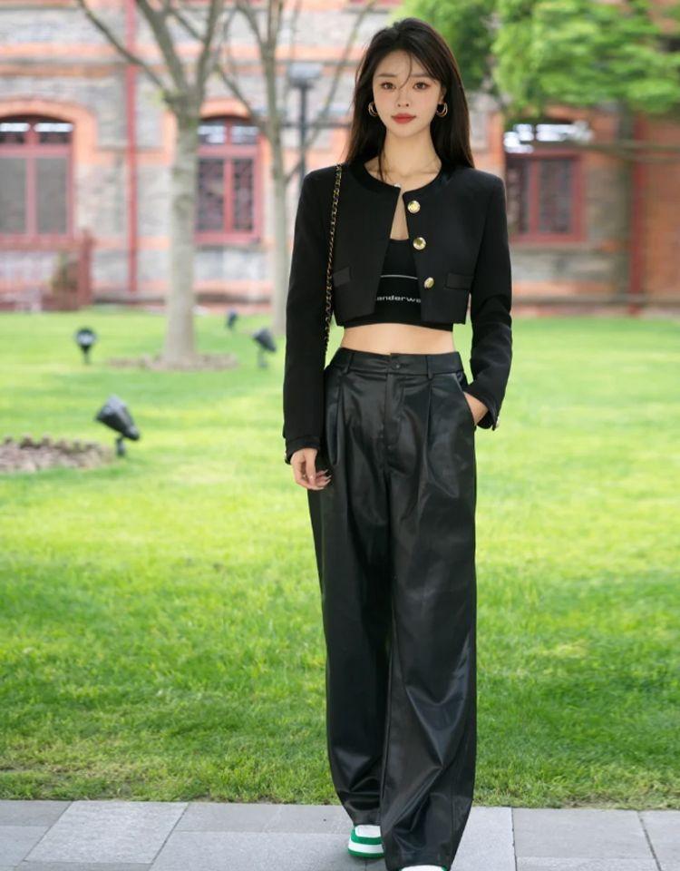 露腰上衣与长裤统一配色,外加撞色西服强化造型层次,分层式穿搭也具备纵向比例的延伸效果,显高又塑形。