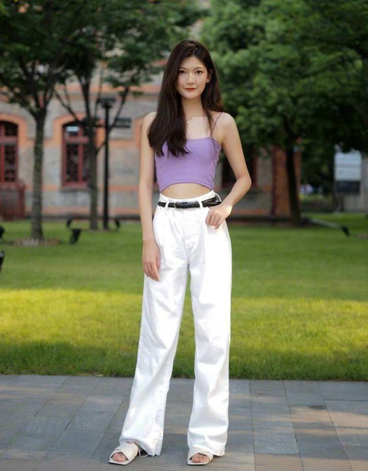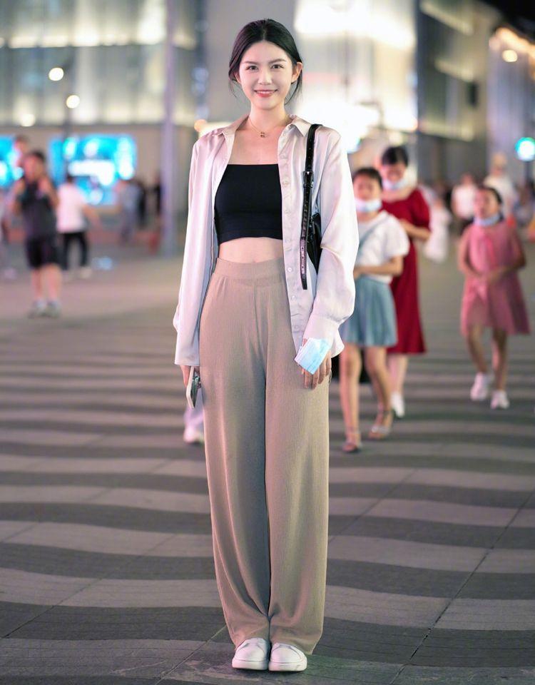 上半身单穿一件衣服,下半身搭配长裤不露脚踝,是最基础的一种穿搭方式, 对上半身身材要求高,不允许有一丝赘肉 ,清爽干练适合夏季穿着。