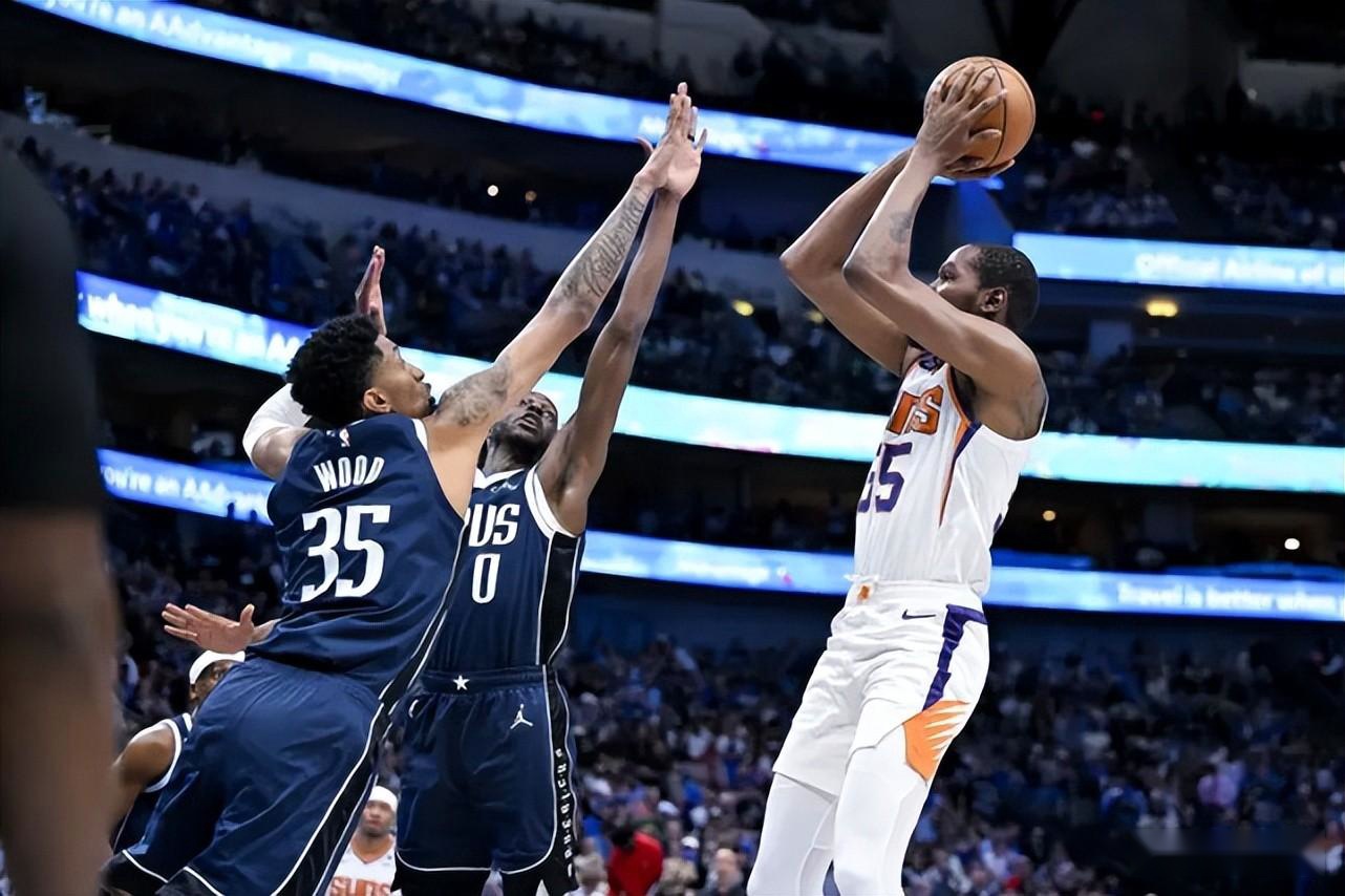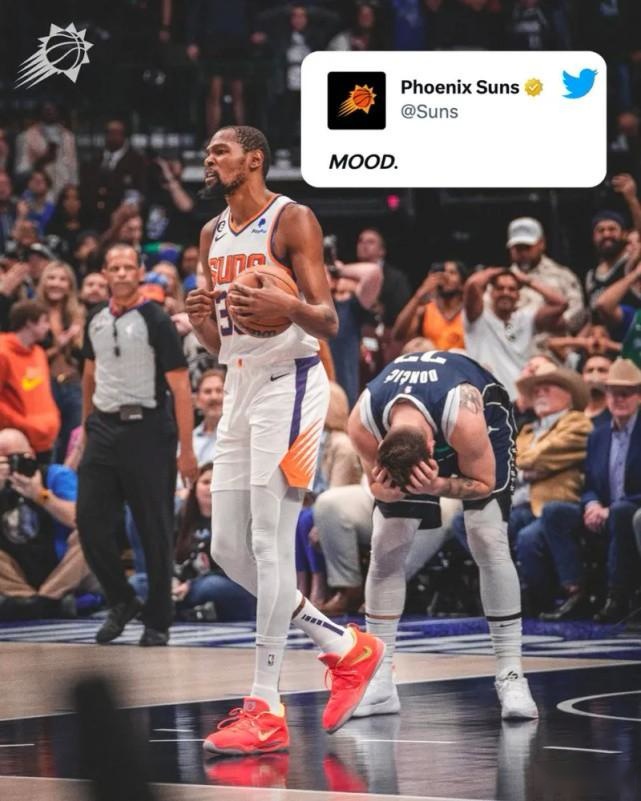 太阳客场130-126战胜独行侠,赛后太阳官推更新了一张杜兰特与东契奇赛场同框图片,并配文:心情如图。