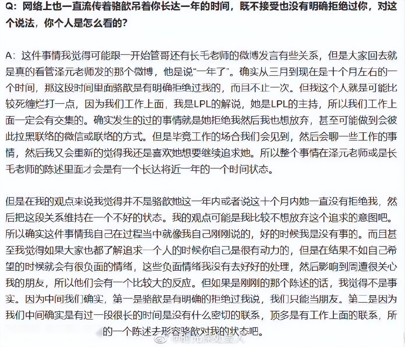 那年记得刚来LPL做解说不久,工作中和工作外就对骆歆产生了好感,男孩子嘛就想追求人家,但骆歆没有答应,并且拒绝了他,但记得这个人凡事就特别较真,恋爱也是,加上工作上低头不见抬头见,所以就变成了死缠难打的感觉,可这种追求的方式在当时的长毛以及管泽元看来,就是骆歆有意吊着记得,于是就有了当年那几条近乎将骆歆职业生涯毁掉的小作文。
