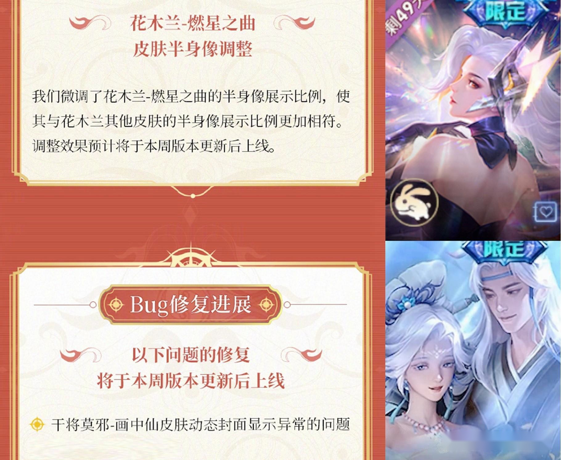 其次“画中仙”半身像动态效果异常修复,新增了流光和花瓣飘飞的动态特效,而花木兰“燃星之曲的”的半身像封面主要调整了身形展示比例,使其大小与其他皮肤相契合。