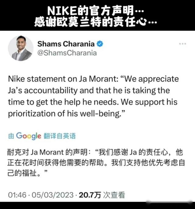 其实,这也很好理解,因为在今年的4月份,Nike将推出莫兰特的签名鞋,如今莫兰特因为炫枪事件多次登上美国热搜,确实也是一个非常好的宣传机会。