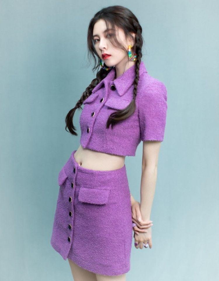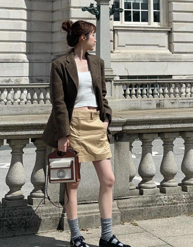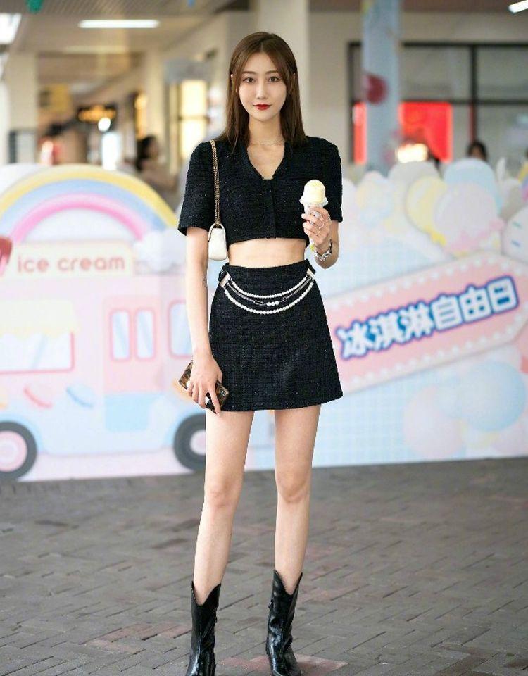 对于微胖身材的女生来说,在穿搭上则可以 减少露肤,弱化性感 ,身穿廓型西服内搭露脐装,下半身搭配露腰遮胯裙做好衔接,适当露肤强调腰线,并利用西服廓型优化上半身比例,整体给人更为纤瘦的感觉。