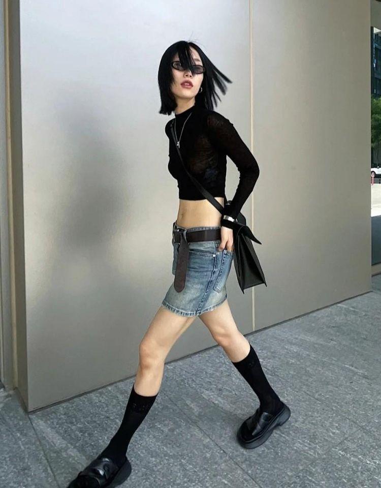 对于腿粗、腿型不直的女生来说,穿露腰遮胯裙时为了避免腿部过多留白而暴露腿型缺陷,可以搭配长袜或长靴减少腿部露肤,利用袜/靴做好与裙摆之间的衔接,纵向比例更有助于弱化腿型问题,视觉上达到显腿长、显瘦的效果。
