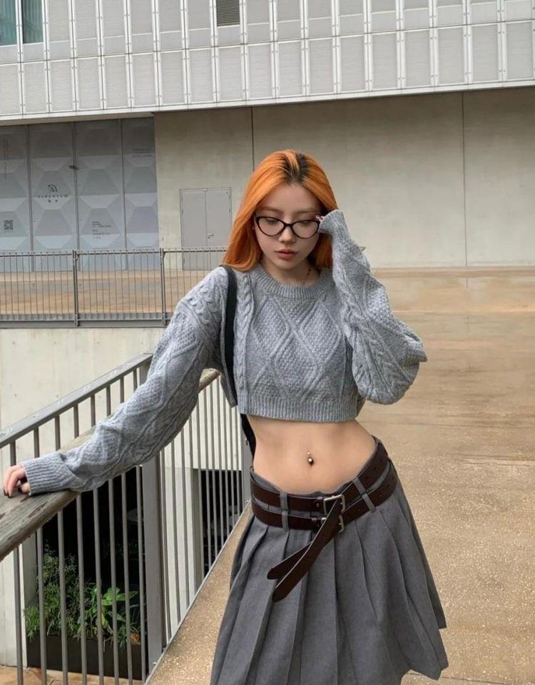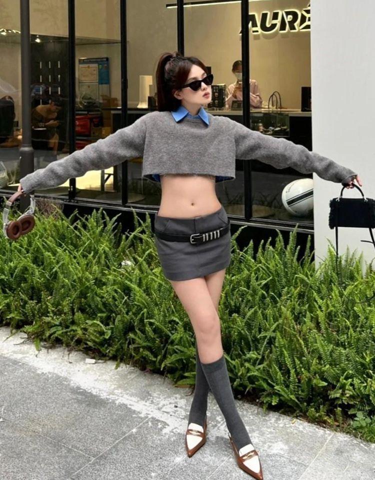为了统一整体造型风格,穿露腰遮胯裙时可以搭配短款针织衫叠加衬衣,叠穿造型强化造型层次, 同色系纵向比例更有助于优化身材线条 ,凸显纤细腰身和大长腿。