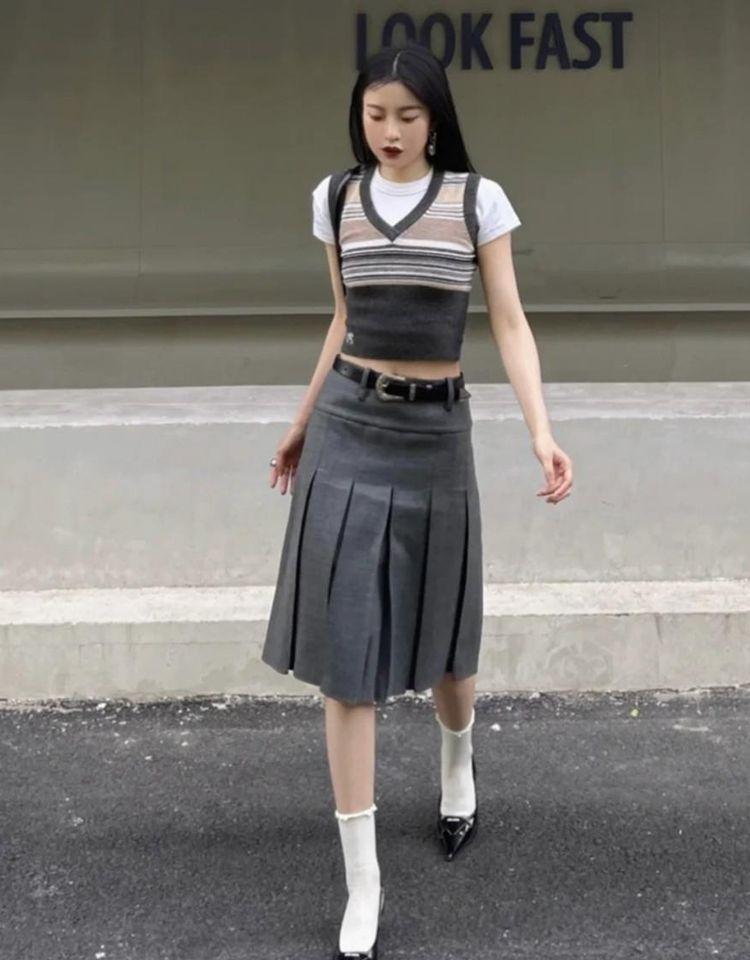 “上半身纤细、下半身微胖” 的女生,可以身着短袖T恤叠穿短款马甲,强调身穿优势;搭配齐膝长度的露腰遮胯裙,并加持高跟鞋和长袜, 掩饰胯宽、腿粗、屁股大的身材问题 ,强调纤细腰身和小腿完善整体塑形。