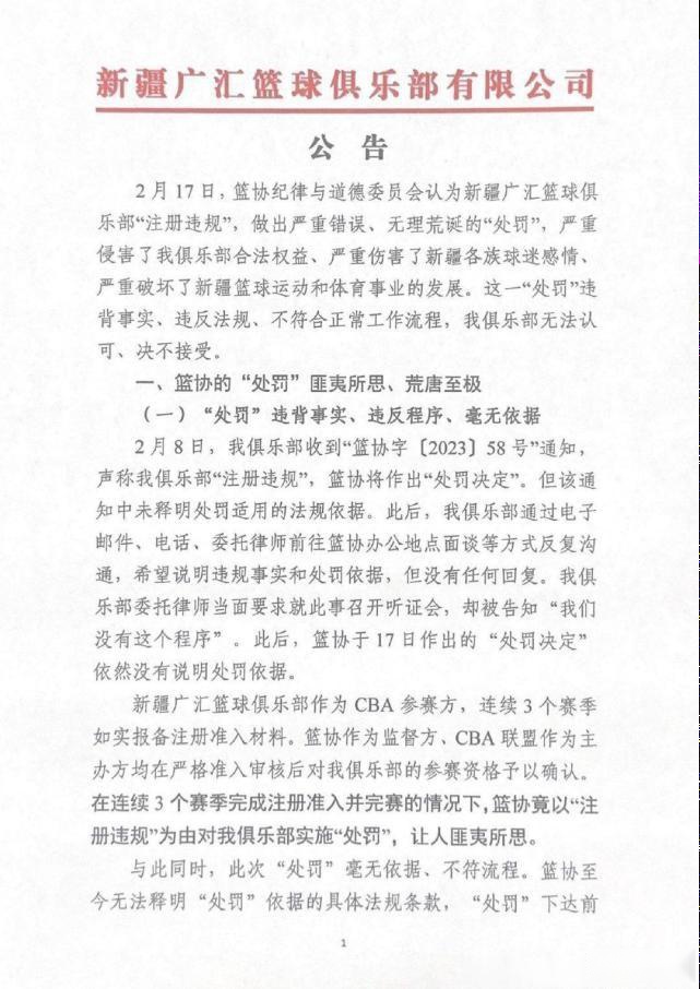 2月18日,新疆男篮回应称不存在注册违规,要求篮协撤销处罚,并以退出CBA联赛来威胁。