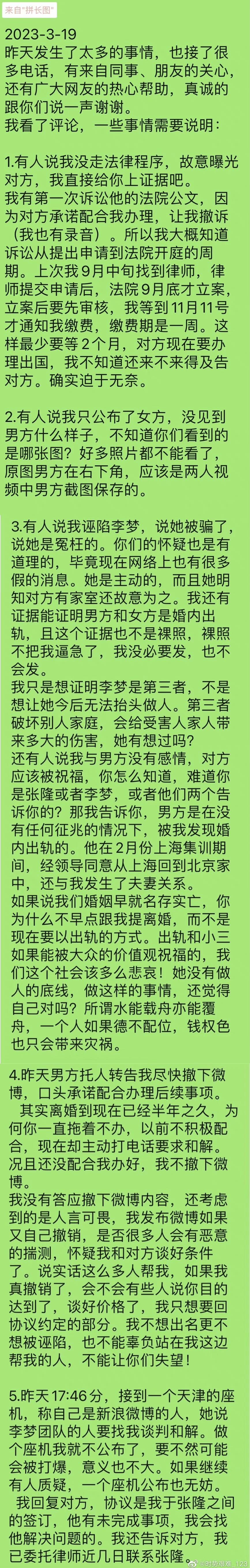 另外,在张隆前妻二次公开的爆料里,还透露李梦团队的人私底下通过网络平台与自己联系,目的就是主动妥协求和,但张隆前妻不愿意和谈和解,就是在网络上曝光李梦的所作所为,以及向张隆讨取应该拿到手的抚养费。
