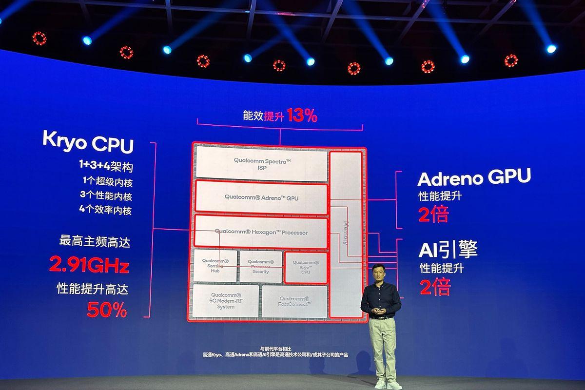 先来说说这颗芯片的具体规格,它的硬件架构完全照搬了骁龙8+芯片,不过频率稍作调整。Cortex X2超大核心的频率从3GHz下调到了2.91GHz,另外两组核心的频率不变,依旧是2.5GHz和1.8GHz。GPU命名也从Adreno730变成了Adreno725。