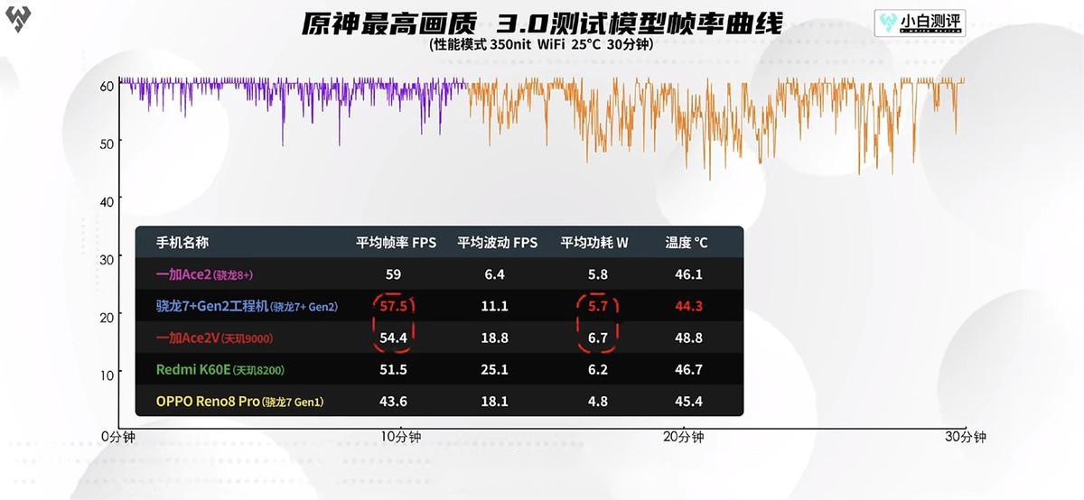 那么具体到游戏体验上有什么差距呢?以原神为例,骁龙8+手机跑到了59帧,功耗5.7W;骁龙7+ Gen2跑到了57.5帧,功耗5.7W。也就是说两者夸张的GPU频率差异并没带来太多的性能差异,功耗相同的情况下,平均帧率也只是低了1.5帧而已。当然不排除如果放开60fps限制,骁龙8+会跑得更高。而天玑9000表现反而不如骁龙7+ Gen2,因为功耗太高了。
