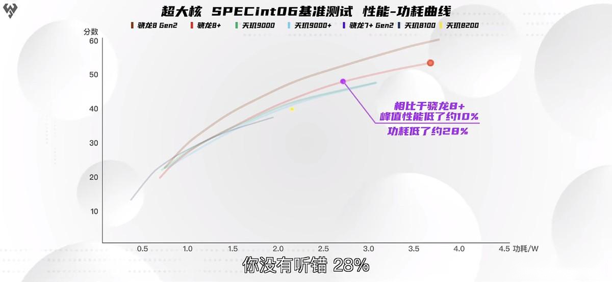 通过原神的帧数不难发现,骁龙7+ Gen2似乎刚好在性能和手机散热能力的平衡点上,小白评测的能耗曲线也证实了这一点。和骁龙8+相比,骁龙7+ Gen2的CPU部分的峰值性能低了10%,功耗低了28%;GPU峰值性能低了25%,但功耗低了40%。