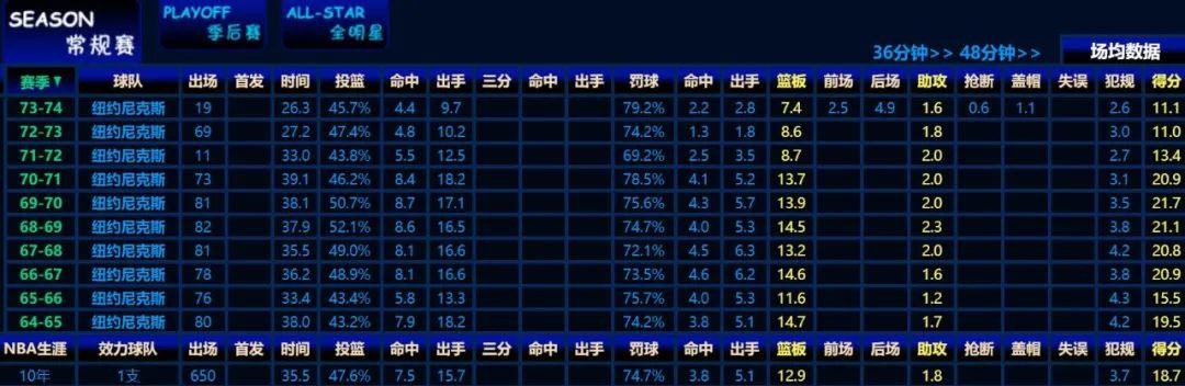 2019年,A-史密斯说出那句经典台词:“ 尼克斯上次夺冠时我5岁,现在我都51岁了。 ”没错,尼克斯最后一次夺冠正是1973年!一人一城,里德把整个生涯奉献给了纽约尼克斯,1974年4月,32岁的他因伤退役。里德常规赛和季后赛数据如下: