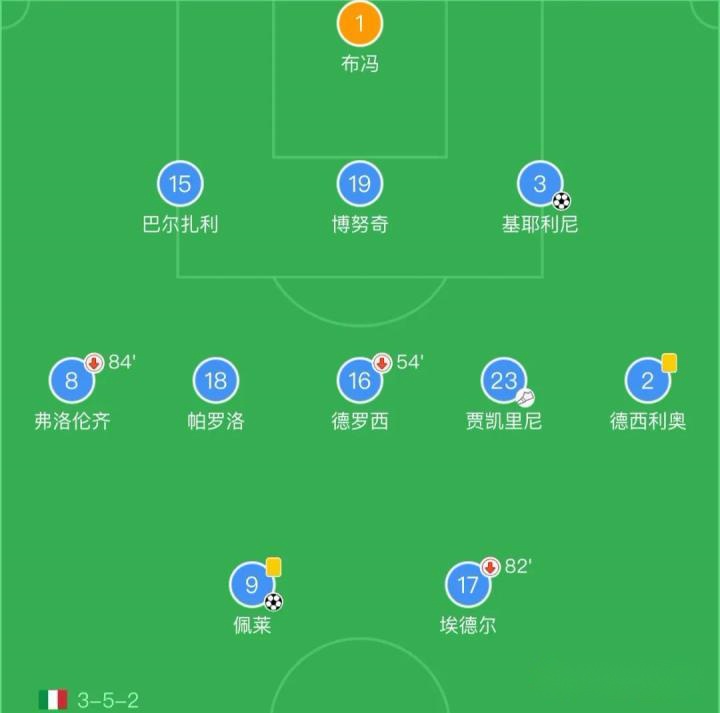 和曼城这一套以技术性和侧重控球能力的三中卫阵型形成鲜明对比的便是2016年欧洲杯上的由孔蒂带领的意大利国家队,配合意大利国家队传统的链式方式和强大的反击能力,孔蒂在球队的阵容相对的“平民化”的情况下成功的将一支相对“平民”的意大利队带到了1/4决赛,最后也只是惜败阵容更强的德国队。在那只意大利国家队中,左右的两个边翼卫:弗洛伦齐和德西利奥都是属于攻守兼备的相对传统的边后卫/边翼卫,防守的能力都较为出色的同时具备很好的上下往返能力,三个中卫的组合是意大利经典的BBC:巴尔扎利、博努奇和基耶利尼的组合,这三个人的中卫组合也是世界足坛过去的十几年中被普遍认可的最强的中卫组合之一,巴尔扎利和基耶利尼负责扫荡、补位和覆盖,博努奇负责居中的出球。中场三个人分工相当明确,德罗西负责拖后防守,那个赛季状态出色的贾凯里尼负责中场的拿球和推进,帕罗洛负责中场的覆盖和前插得分,锋线也是经典的一高一矮的佩莱和埃德尔的组合,佩莱强大的支点和头球能力很好的充当了一个“桩”的作用,埃德尔的机动性、射门能力很偏向于早年的皮耶罗和朱塞佩·罗西那样的意式二前锋,和中场活动自由度较高的贾凯里尼会有很多的呼应和换位。其实单看这个阵型搭配是一个非常经典和传统的352标准人员配置,但这套阵容的一个亮点就是意大利教练非常擅长的所谓“三个半”的战术思路。由于德西利奥是一名右脚打左路的逆足球员,同时自身的速度和对进攻的推进作用远不如对侧的弗洛伦齐,所以在实际的比赛站位中,德西利奥会更多的回到中位线和BBC组合形成一个四后卫的站位,只会在必要的时候适当的压上帮助边路的拿球,同时德西利奥有一脚非常出色的逆足传中能力,也可以和中路的佩莱形成很好的联系。弗洛伦齐则会充当一个更偏向于边翼卫的角色,进攻前压较大,防守也能退回来补充防线人数,对阵德国队的1/4决赛弗洛伦齐就有一次经典的门线脚后跟解围的经典场面。这支球队强大的执行力、防守的稳定性和反击的高效帮助意大利队连续击败比利时队和西班牙队这样的顶级的技术型球队,堪称意式防守反击的教科书案例。
