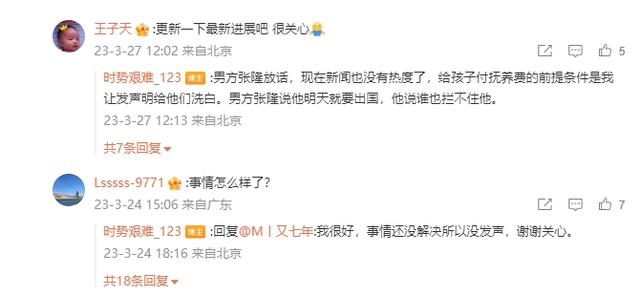 有网友在社交媒体上问赵蕾,希望她更新一下最新进展。赵蕾回答,张隆放话现在新闻没有热度了,要想他支付孩子们的抚养费,就需要赵蕾先发声明替他们洗白。赵蕾还透露张隆明天就要出国,还放话谁也拦不住他。