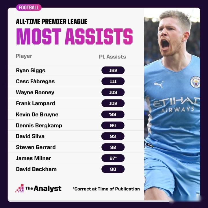 德布劳内距离成为第五位英超助攻上百的球员只差1次