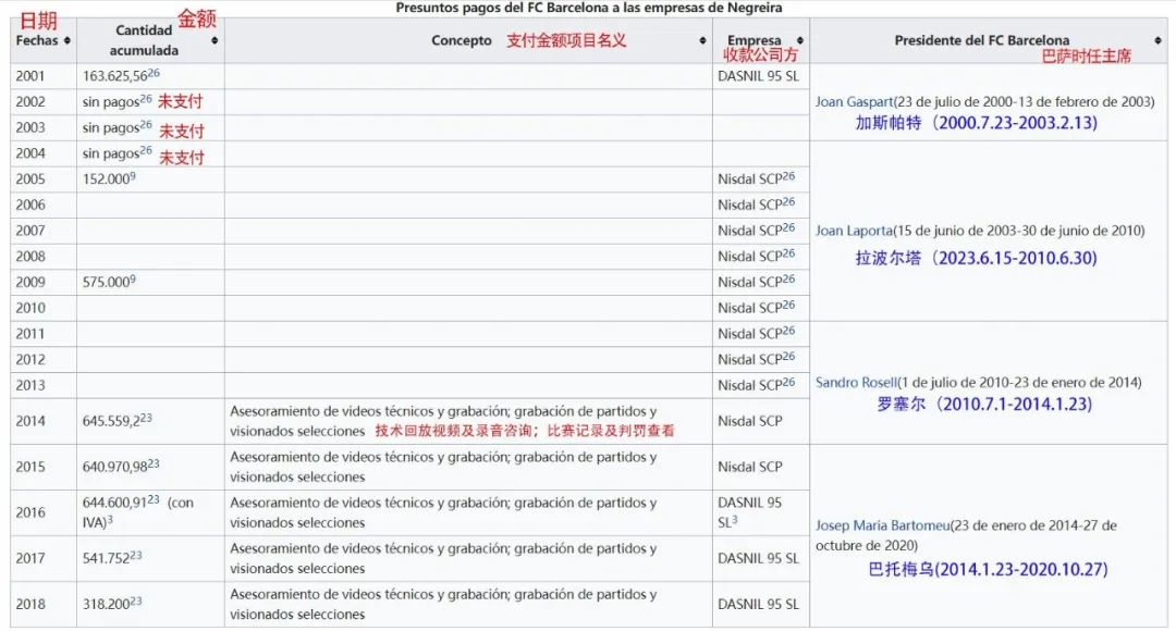除了这样一个猛料曝光之外,根据《世界报》获得的西班牙财政部文件显示,前裁判委员会副主席内格雷拉将大部分巴萨付给他的公司DASNIL 95的钱,用来给西甲裁判送礼。根据财政部此前驳回的一份该公司在2016年的购置单据扣税申请,DASNIL 95花4460欧购置了1500张红牌和黄牌,还花了2032欧买了几百枚赛前选择球门用的硬币。