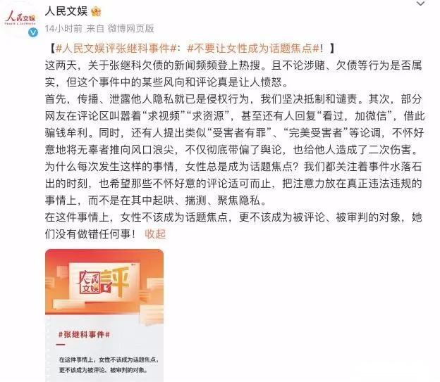 人民日报痛斥了那些在事件发生之后,各种在网上求资源的网友,以及那些声称自己手里有资源,而在社交平台上骗取钱财的不法分子们。直言: 为什么每次发生这样的事情,女性总是成为话题焦点?我们都关注着事件水落石出的时刻,也希望那些不怀好意的评论适可而止,把注意力放在真正违法违规的事情上,而不是在其中起哄、揣测、聚焦隐私。