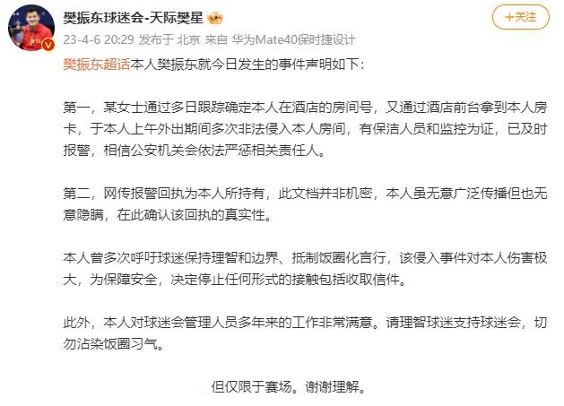 樊振东是没有任何社交媒体账号的,所以发布相关新闻的一般都是通过“樊振东球迷会-天际樊星”,这次樊振东还原事情的经过,同时确定报警回执单的真实性,再度抵制饭圈文化,称侵入事件对本人伤害极大,为保障安全,决定停止任何形式的接触包括收取信件。
