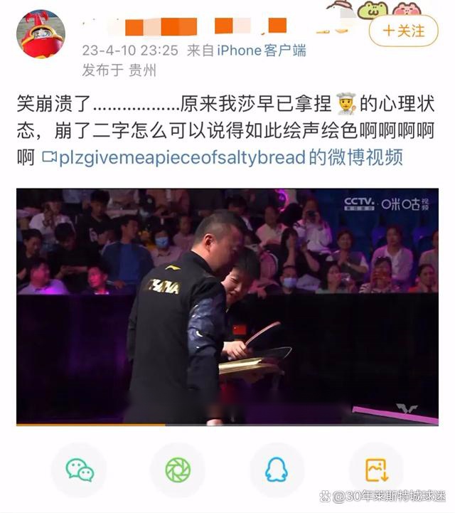 球迷调侃就算了,没想到现在连球员都敢在比赛现场当面开涮马琳了。这场比赛,出现一段搞笑对话!马琳急不可耐:“那个球,你上去一个怒回,哇!”孙颖莎却坏笑:“那球儿我回完,我就知道你肯定在底下崩了。(笑)崩了!”马琳看到弟子还逗他,都快气得说不出话了:“那球你拉也可以啊,那球......”