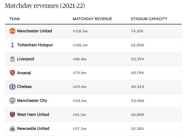 知名足球媒体《The Athletic》统计了英超上赛季比赛日收入位列前八名的球队,其中,曼联以1.105亿英镑的营收高居榜首,热刺、红军分列二三位,曼城仅排在第6,新贵纽卡斯尔排名第8。