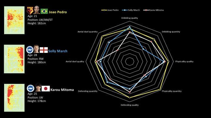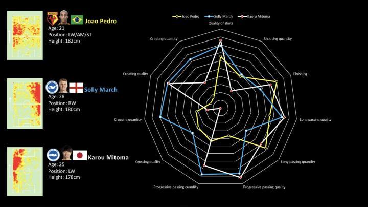 与布莱顿两个边锋马希和三苫薰的数据相比,你可以看到若昂-佩德罗总是能找到更好的位置破门得分,他的终结能力也比目前布莱顿的边锋要强。但佩德罗需要进一步提升自己的传球质量和关键传球的能力。