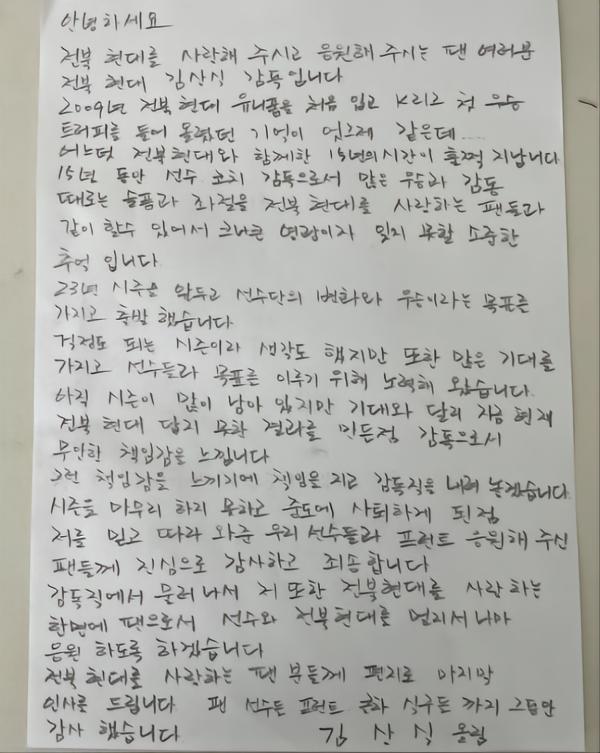 几乎是同步!在水原三星蓝翼官宣主帅没有太久,同一天“热度”和“头条”就被全北现代汽车抢了!由于战绩不佳,全北现代汽车主帅金相植主动选择了辞职,他也成为了今年K1联赛第二位下课的主帅。在离开球队的时候,金相植通过球队的官方平台发布了自己手写的一封致歉信,表示:“2009年第一次身披全北队服,举起K联赛冠军奖杯,仿佛就在昨天,但在全北队度过的15年,转瞬即逝。这是一份莫大的荣幸,也是一段难忘的回忆。我的目标是在 2023 赛季之前改变球队并赢得胜利。还有很多,但事与愿违,我感到作为主帅应该为成绩负责,所以我决定承担责任,放弃我的位置。对于我在赛季中途退赛这一事实,我向相信我的球员和在一直支持我的球迷表示由衷的感谢和歉意。我会在远方为全北加油。向热爱全北的球迷们致以最后的问候。非常感谢。”