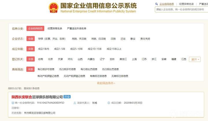 据国家企业信用信息公示系统网站显示,中冠球队彬州辉龙已更名为陕西长安联合足球俱乐部。