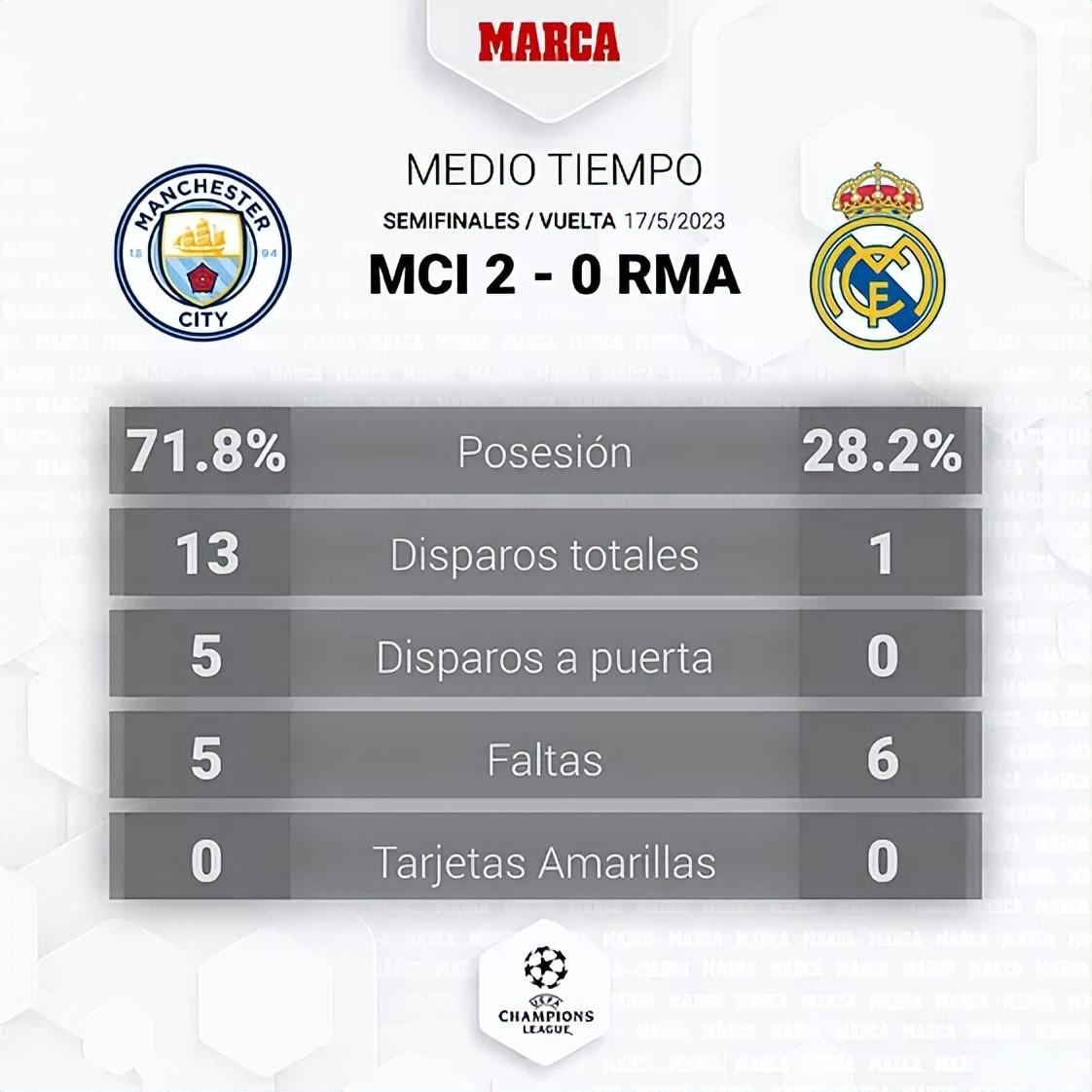 曼城的表现令人惊讶,尤其是在上半场牢牢占据着主动,控球率高达71%,皇马甚至有1次射门。凭借贝尔纳多-席尔瓦14分钟的两个进球,曼城以2比0取得领先。在下半场,米利唐打入的乌龙球、阿尔瓦雷斯的进球让曼城锁定欧冠决赛门票。