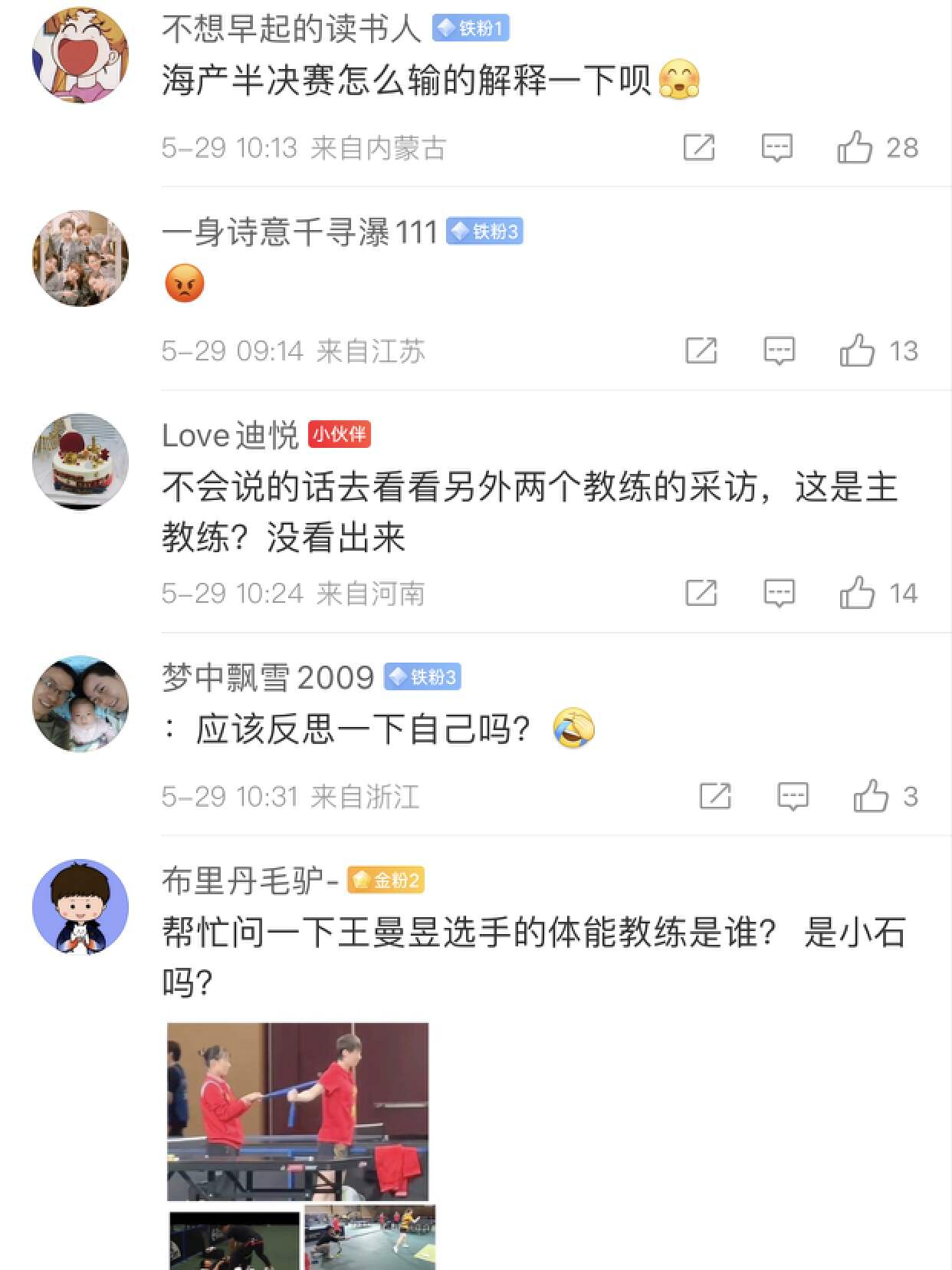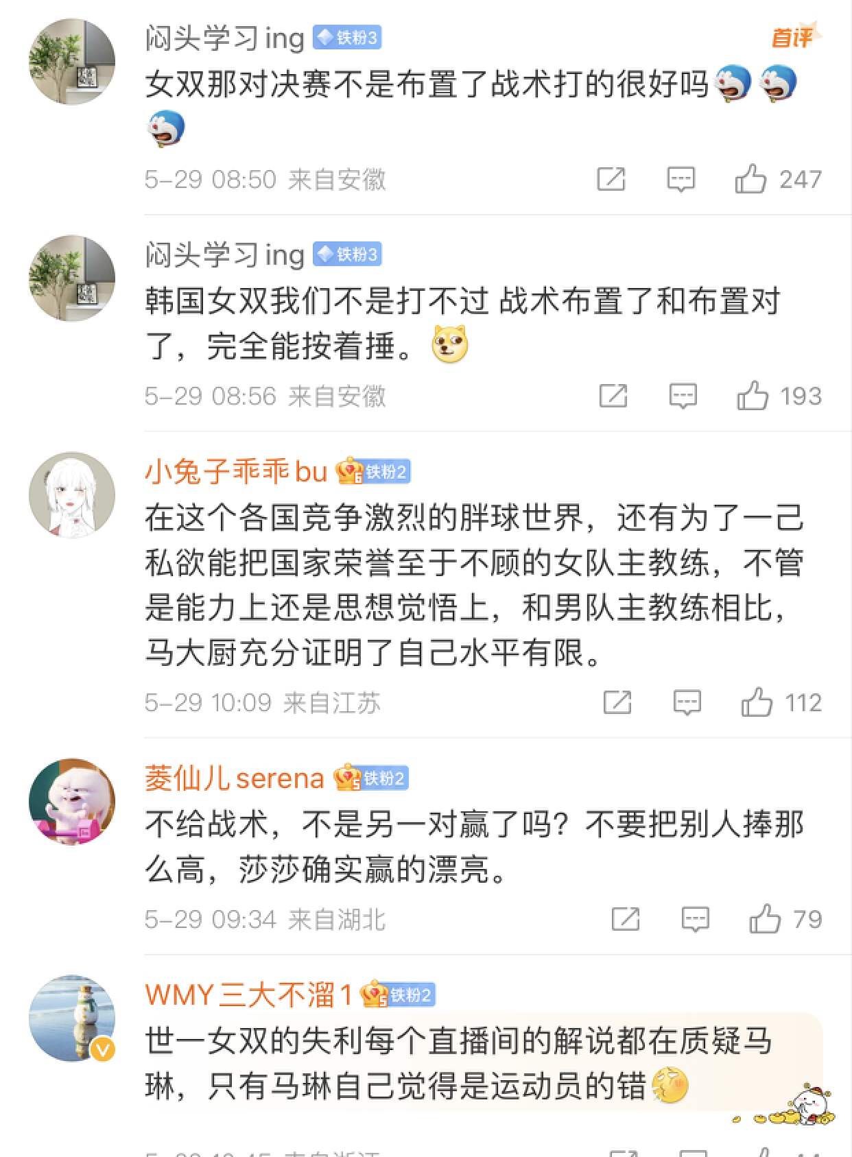 有球迷指出,在女双半决赛中,王曼昱和孙颖莎在局面处于被动的情况下,担任场外指导教练的马琳不仅没有合理利用暂停机会帮助队员调整,反倒来了一句“你们自己想办法!”因此,在这些球迷看来,女双卫冕冠军之所以爆冷输给韩国队,马指导需承担一定责任。也有网友认为,陈梦和王艺迪在女双决赛能够横扫在半决赛击败王曼昱和孙颖莎的韩国组合,这得益于马琳在赛前帮助她们精心布置了战术。