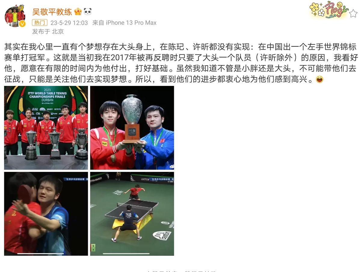 “其实在我心里一直有个梦想存在大头身上,在陈玘、许昕都没有实现:在中国出一个左手世界锦标赛单打冠军。这就是当初我在2017年被再反聘时只要了大头一个队员(许昕除外)的原因,我看好他,愿意在有限的时间内为他付出,打好基础。虽然我知道不管是小胖还是大头,不可能带他们去征战,只能是关注他们去实现梦想。所以,看到他们的进步都衷心地为他们感到高兴。”