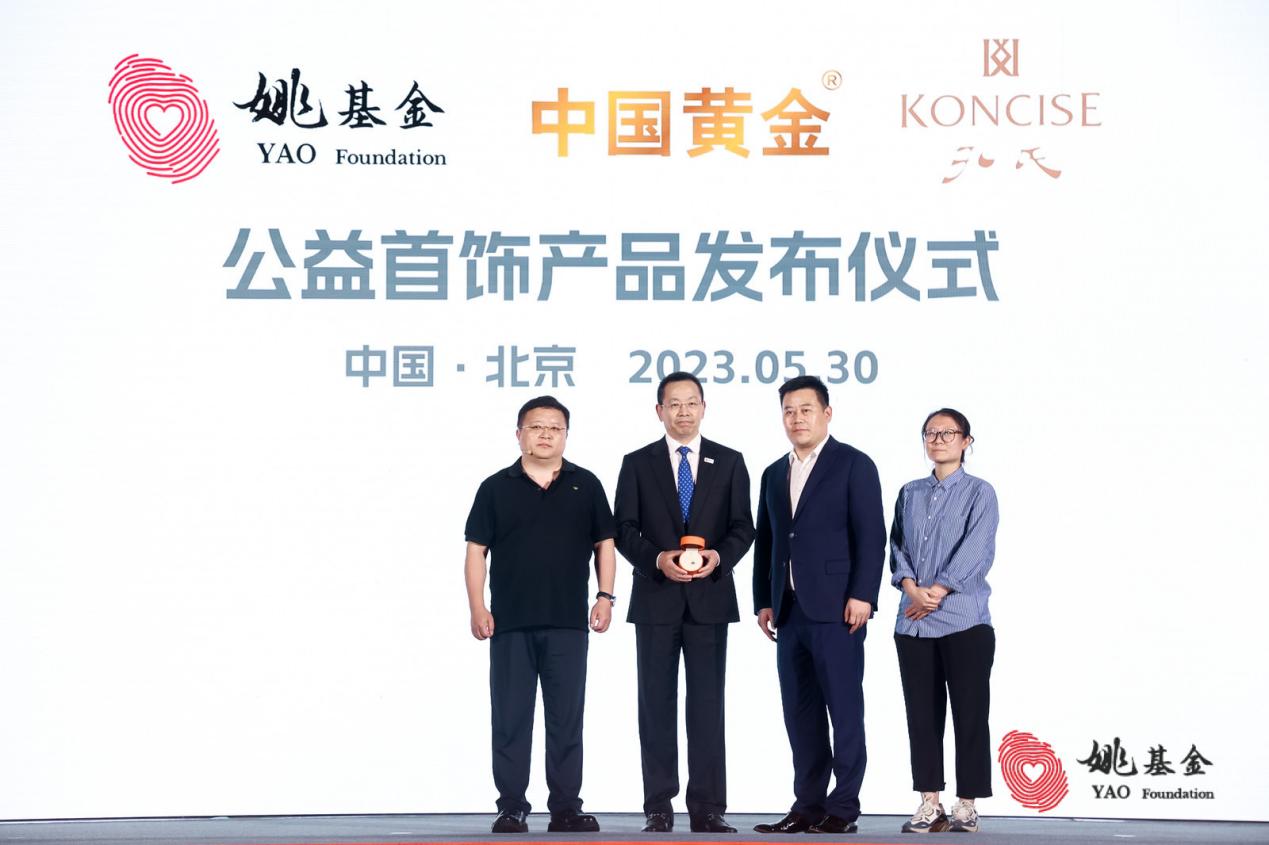 2023年,姚基金与中国黄金、孔氏珐琅达成爱心合作伙伴关系。此次合作将发挥三方在产品设计、生产、渠道,公众公益动员上的各自资源优势,为市场带来有温度的公益首饰产品。由三方共同发布的每一款公益首饰产品的销售额都将捐赠一定比例到姚基金公益项目中,为乡村体育发展助力,同时也能为听力障碍残疾人提供更多的就业机会。当日现场举行中国黄金·孔氏珐琅·姚基金公益首饰产品发布仪式,并发布一款以篮球为灵感设计的公益首饰产品。