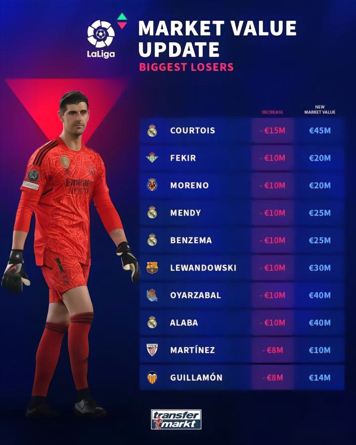 近日,德国转会市场更新了西甲球员身价,并列出了球员身价下跌榜,库尔图瓦下跌1500万欧最多,莱万、本泽马等多人下跌1000万欧。