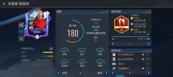○ 这张闪回巅峰斯莫林总评给到了140,搭配叹息之墙的天赋,各项平均数据基本达到了600左右,是版本目前的一流中卫配置。实战中,斯莫林是球队的司令塔,他的AI可以指挥队友跑位布防。他的拦截能力极为出色,可以很好地利用腿长优势拦截对手球路。
