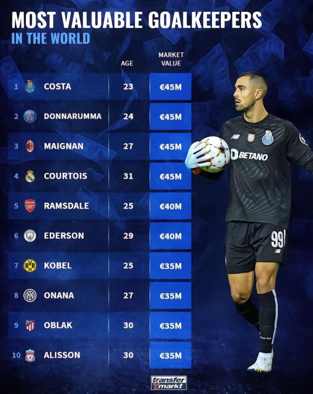 最近德国知名足球数据网站“转会市场”更新了足坛球员们的身价,“转会市场”根据最新的身价评估,列出了目前足坛的门将身价排名,其中波尔图门将迪奥戈-科斯塔、巴黎圣日耳曼门将多纳鲁马、米兰门将迈尼昂以及皇家马德里门将库尔图瓦的身价都为4500万欧。