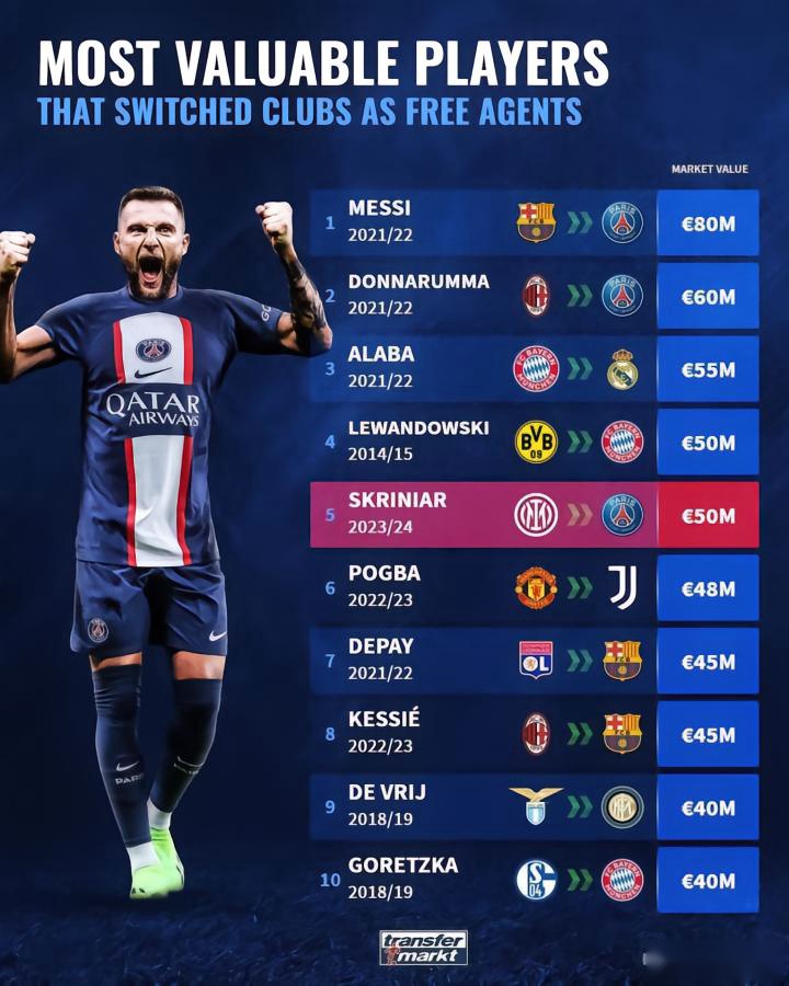 国米的斯洛伐克后卫什克里尼亚在合同到期后以自由身加盟巴黎圣日耳曼,德国转会市场网站盘点了自由身转会的球员身价榜,2021年的梅西以8000万欧居首,什克以5000万欧排名第五。