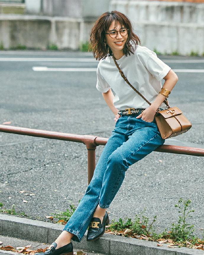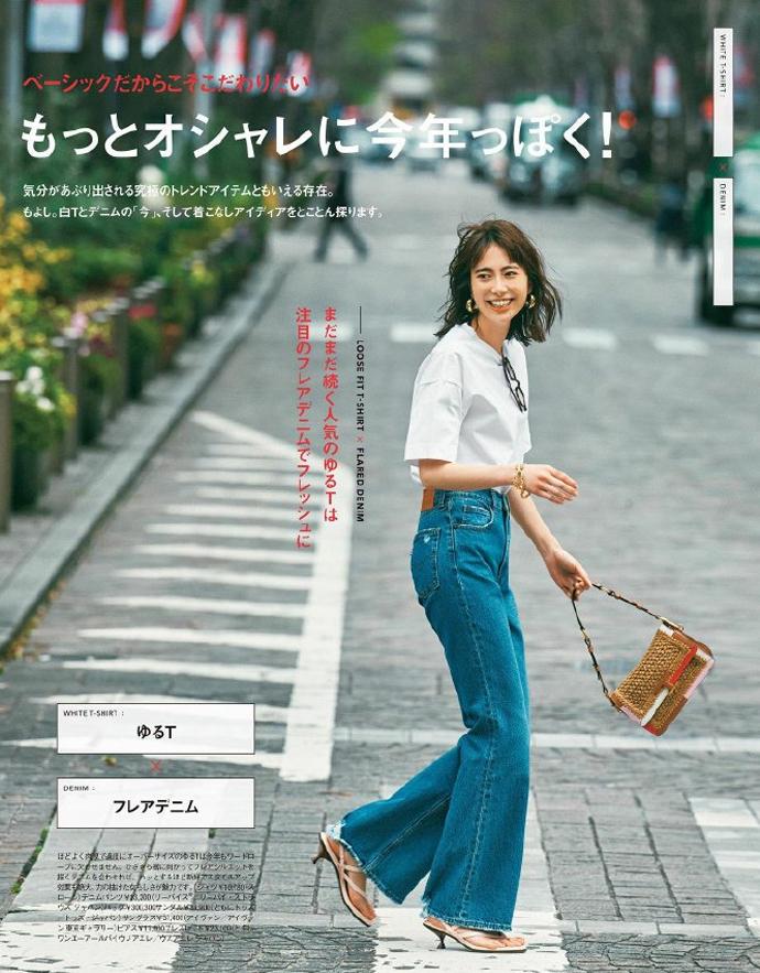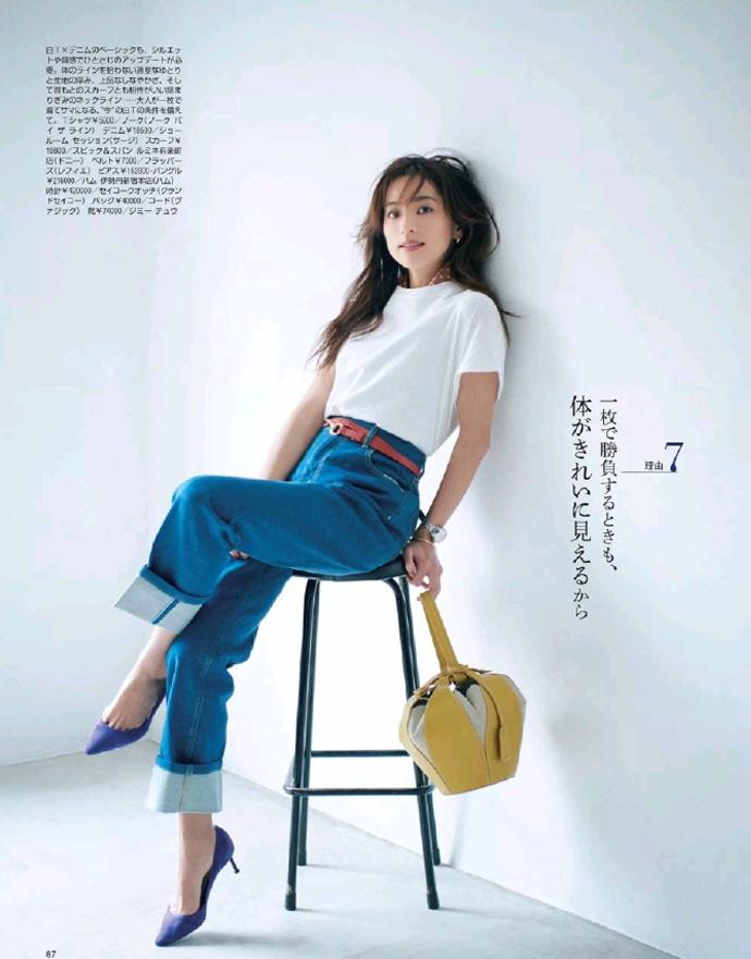穿衣打扮最讲究的就是塑形,而腰线作为身材比例的分割线,在穿搭时一定要将其凸显出来。穿白T恤配牛仔裤,最简单的显腰法就是“塞衣角”,将T恤衣摆塞进裤腰,强调腰线位置,凸显腿部线条,进而优化比例。