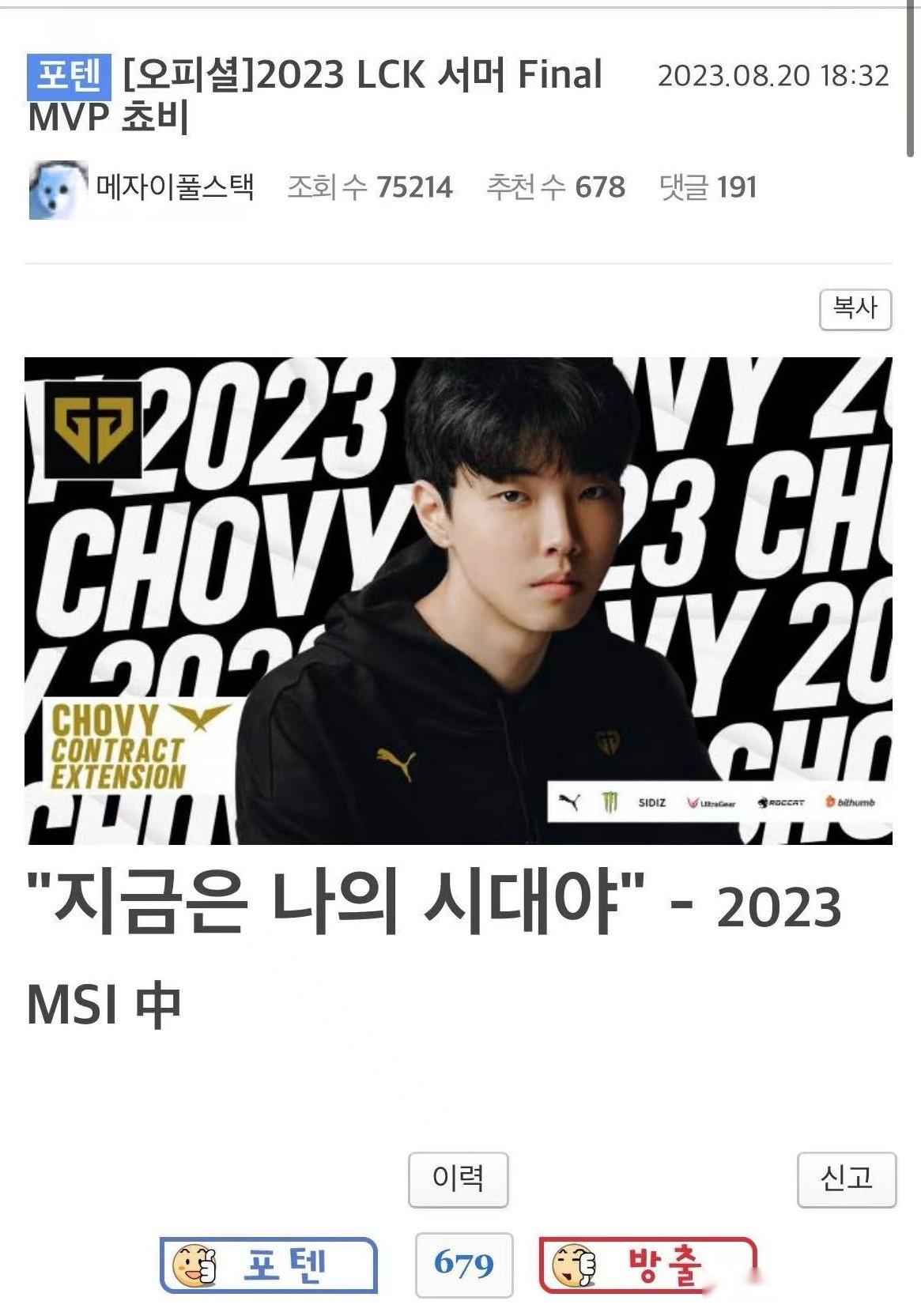 -官方消息:2023年LCK夏季赛决赛FMVP chovy。现在是我的时代。