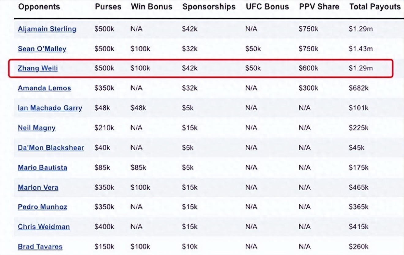 不到一年时间,张伟丽的单场奖金翻倍,正式进入单场收入超百万美元行列,这也体现张伟丽的实力,单场50万美元的出场费意味着张伟丽已经是顶级 UFC选手。2021年,当时张伟丽不敌罗斯的那场比赛,她的单场收入为13.2万美元,出场费是10万美元,仅两年时间,张伟丽的出场费用就翻了5倍。