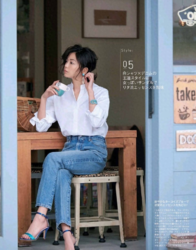 牛仔裤是一种可塑性非常强的裤子,无论是日常休闲还是职场通勤中都能驾驭。将牛仔裤与白衬衣组合,呈现出来的造型风格简约、干净又大气,没有丝毫的拖泥带水,将衣摆塞进裤 腰强调腰线,塑造三七分比例显高又显瘦 。