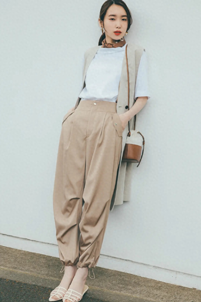 锁脚裤不挑身材和身高,即便是小个子女生也能驾驭。上半身搭配T恤并叠穿马甲,强化造型层次,脚踩一双高跟鞋,适当增加脚背、脚踝露肤, 拉长腿部线条,视觉上优化身材比例, 达到显高显瘦的效果。