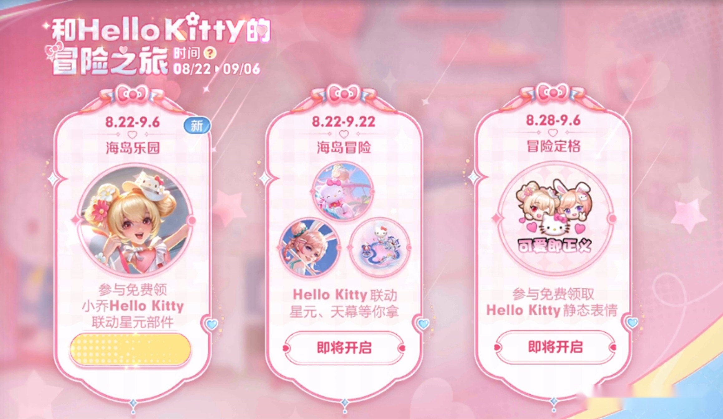 此次上线的和“ HelloKitty ”冒险之旅涵盖三大活动,涉及了小乔、阿离星元和定制表情的获取,我们先来看看小乔联动星元如何得到?