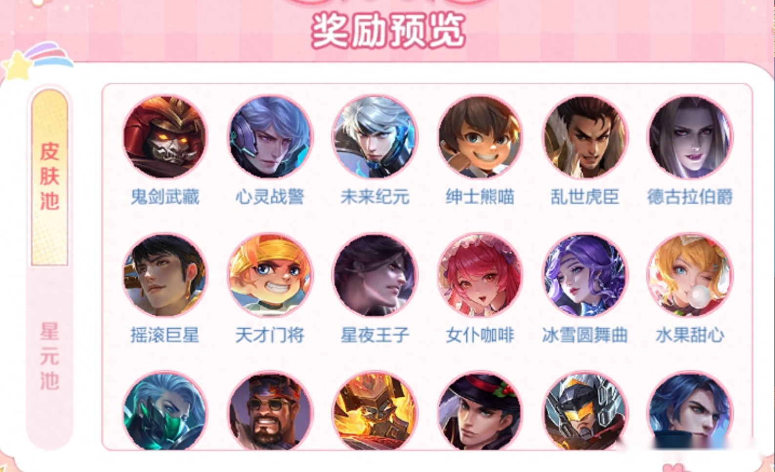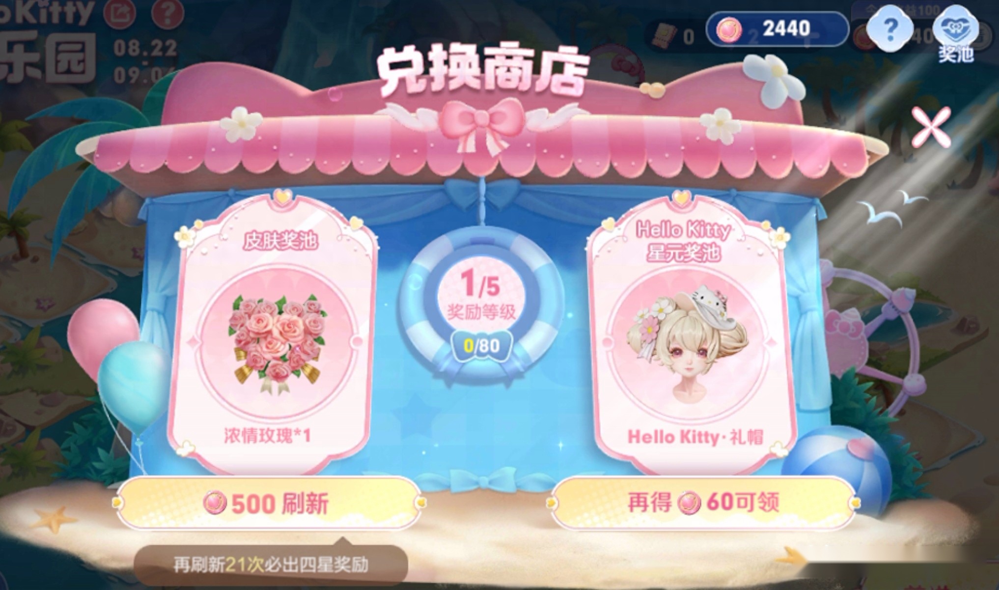 收集到乐园币可以用来刷新奖励,每消耗500乐园币刷新一次,刷到心仪的奖励可选择替换,其中奖励包含了二星、三星、四星和五星4个档位,其中3/4/5星为皮肤奖励,且在刷新次数达到20次和80次时可以必出勇者、史诗皮肤。另外玩家累计收集15000个乐园币即可得到小乔缤纷独角兽的Hello Kitty全套星元部件。
