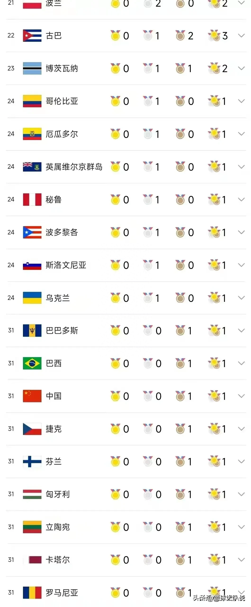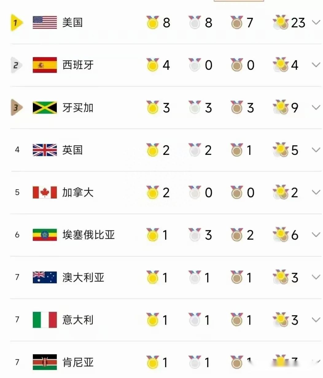 北京时间2023年8月26日,布达佩斯田径世锦赛继续酣战,第7比赛日4枚金牌的争夺战中,美国、牙买加、日本、委内瑞拉将4枚金牌平均分配收入囊中,目前最新的奖牌榜上,美国8金8银7铜共23枚奖牌高居金牌榜和奖牌榜第1,金牌榜第2为西班牙的4金,第3为牙买加的3金,而总奖牌榜上牙买加9枚奖牌位居第2,埃塞尔比亚6枚奖牌排名第3。中国目前1铜奖牌位居奖牌榜第31位。